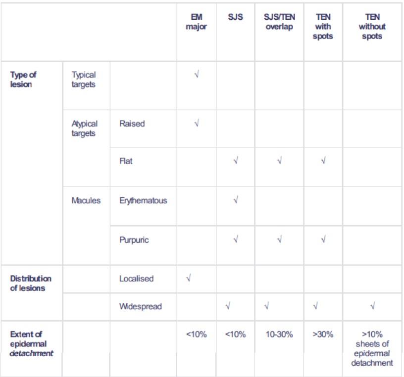 Stevens-Johnson syndrome diagnosis is based on clinical classification - as in the table, above - and on histopathology.