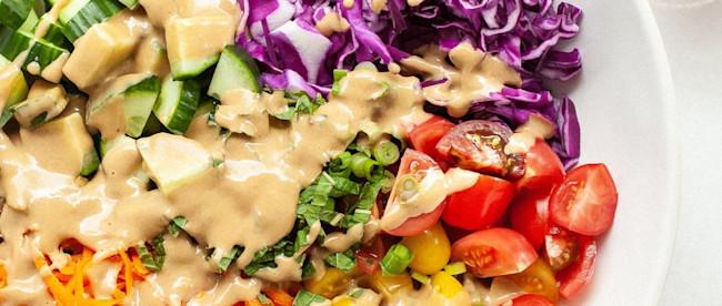 This summer salad is a great stand-alone lunch dish or side dish. Red cabbage, red cherry tomatoes, cucumber, yellow cherry tomatoes, carrots, and blueberries are colourful, refreshing, and rich in vitamins and antioxidants. The creamy balsamic dressing includes maple syrup and tahini which packs-in flavour.